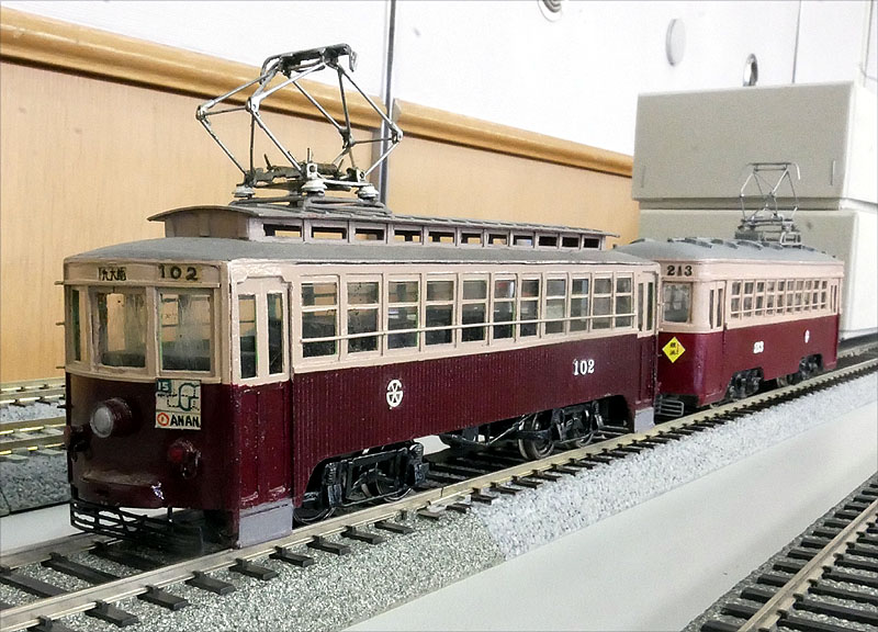 西鉄でも市内線の路面電車 102形。実物は木造ですが、模型はペーパーによるフルスクラッチ。1975年に製作、台車は自作、インサイドギヤは市販品を改造。