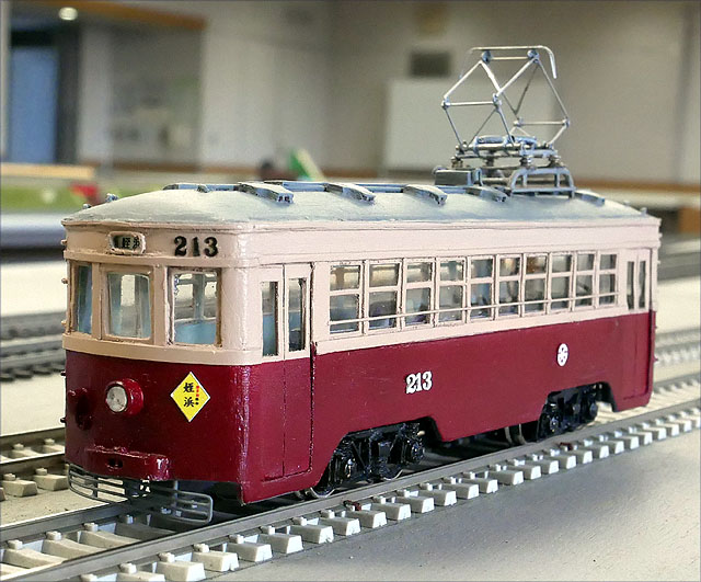 次も西鉄の路面電車、213形。ペーパー製フルスクラッチ。1974年製作の第一作、台車は自作、インサイドギヤは半分に短縮改造。